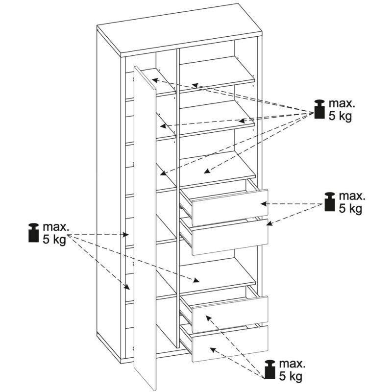 sudaryta iš vienų durų dalies ir su keturiais stalčiais ir keturiomis atviromis angomis. Kairėje pusėje yra penkios lentynos. Natūralaus dekoro dėka Shetland Komplektas idealiai tinka tamsesniems interjerams. Jos masyvesni kūnai su madingais horizontaliais grūdeliais primena skandinavišką stilių – tai žalias, natūralus ir tuo pat metu elegantiškas derinys. Be to, atskirų elementų rutuliniai įdubimai kontrastuoja su visa kolekcija, įkvėpta ąžolas Shetland gamtos.