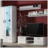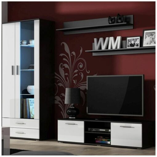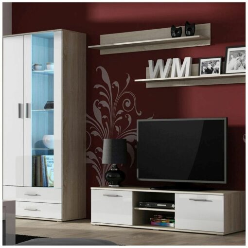 – 1x Vitrina S6 2D2S (A / p / i-192/80/41 cm) sudaro du stalčiai ir dvidurė, iš dalies įstiklinta sekcija, kurios viduje yra šešios lentynos