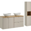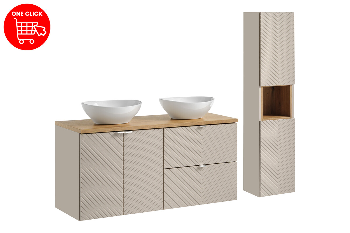 Šio komplekto spalvos, įskaitant ąžuolo ir kašmiro atspalvius, suteikia šilumos ir elegancijos pojūtį, o modernūs apdailos elementai pridės šiuolaikiškumo. Pasirinkite šį komplektą, kad sukurtumėte savo svajonių vonios kambarį.