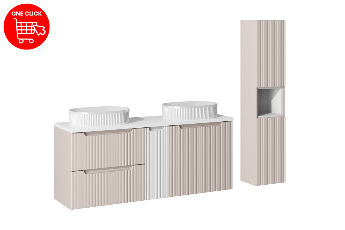 Su vertikaliai frezuotais frontais ir šiuolaikiškais akcentais, šis komplektas suteikia voniai unikalumo ir šarmingumo. Matinės kašmyro ir baltos spalvos derinys vizualiai išplečia erdvę ir sukuria šviesią, jaukią atmosferą.