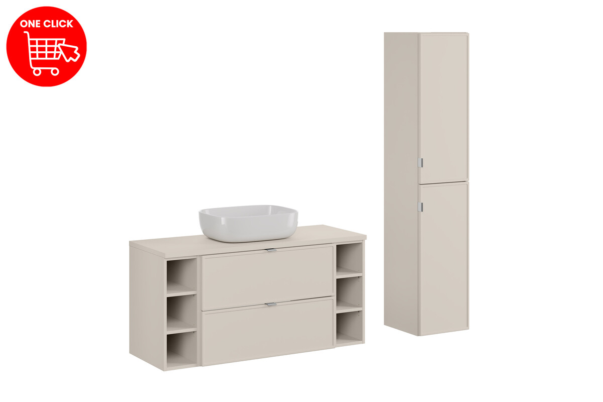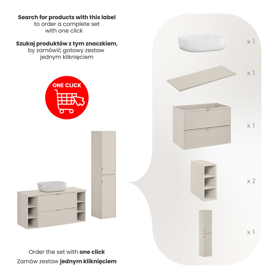 Susipažinkite su vonios baldų komplektu, kuris ne tik suteikia puikų funkcinį sprendimą, bet ir paverčia jūsų vonios kambarį modernaus dizaino oaze. Kolekcija Bella Cashmere išsiskiria savo stilingumu ir išskirtiniu charakteriu, todėl kiekvienas elementas neabejotinai papuoš jūsų erdvę.