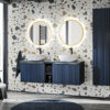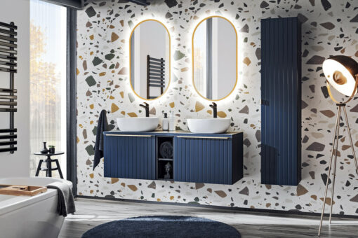 Vonios baldų komplektas sukuria estetišką ir harmoniją perteikiančią aplinką. Modernūs veidrodžiai ir elegantiškos spintelės užtikrina ne tik patogią prieigą prie reikiamų priemonių, bet ir puikiai dera su bet kokiu interjero stiliumi. LED apšvietimas suteikia papildomą šviesą ir optiškai išplečia erdvę.