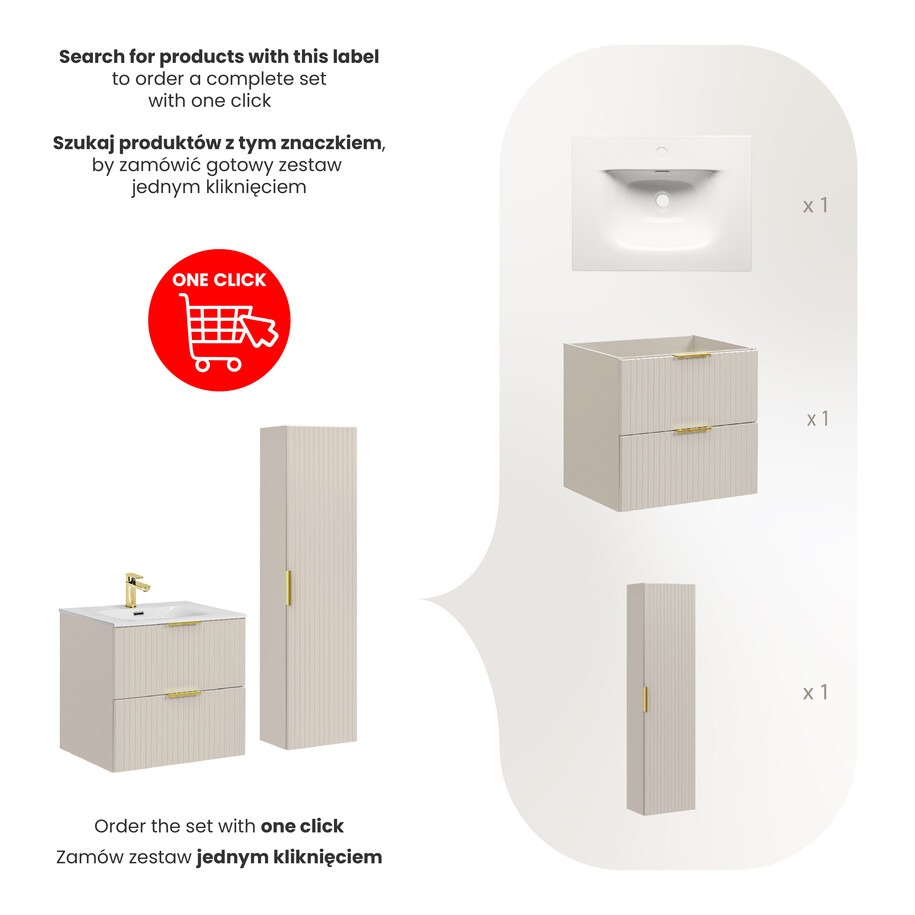Rinkinys apima viską, ko reikia, kad jūsų vonios erdvė taptų funkcionalia ir patogia. Aukštas stulpas ir erdvi spintelė puikiai talpina visus būtinus vonios aksesuarus ir kosmetiką, padedant išlaikyti tvarką ir švarą. Be to, pasirinktos rankenėlės – auksinės, chrominės ar juodos matinės – leidžia dar labiau pritaikyti interjerą pagal individualų skonį.