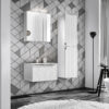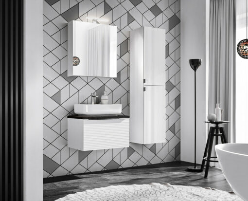 Vonios spintelė su veidrodžiu sukuria vizualinį gylį, o praustuvas suteikia galimybę lengvai ir greitai atlikti kasdienes higienos procedūras. Aukšta spintelė ir stalviršis leidžia patogiai laikyti visus reikiamus priedus, kad jie būtų po ranka.