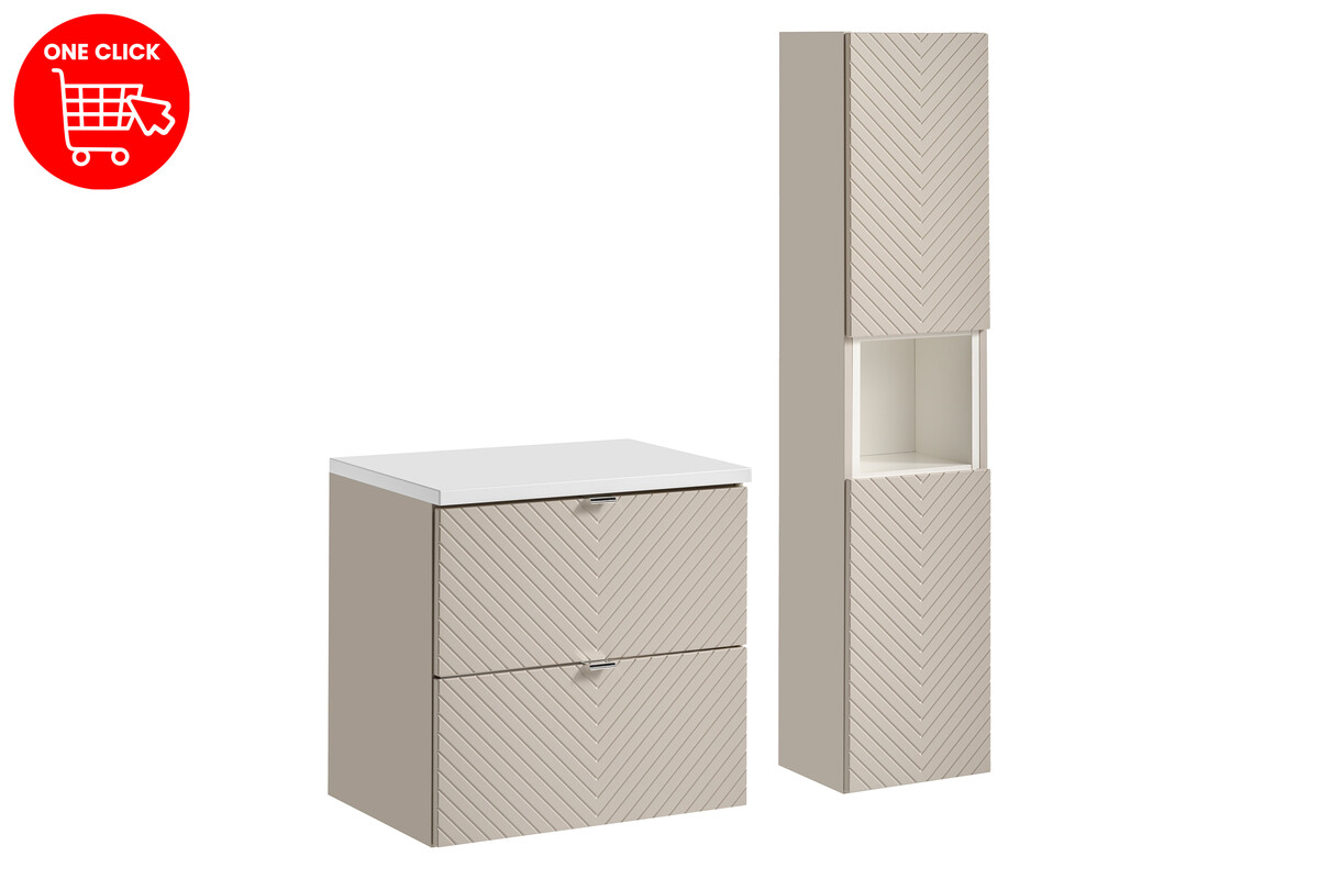 Komplektą sudaro aukšta vonios spintelė, kuri ne tik suteikia pakankamai vietos vonios reikmenims, bet ir išlaiko erdvę tvarkingą. Taip pat yra vonios lentyna, kuri padeda organizuoti visus jūsų asmeninės higienos produktus. Be to, stalviršis natūraliai sukuria estetišką ir harmoningą bendrą vaizdą.