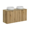 Komplektas pasižymi šiuolaikiniu estetiniu sprendimu, kuris prideda vertės bet kuriai vonios patalpai. Ąžuolo spalva praturtina erdvę, sukurdama šiltą ir jaukią atmosferą. Su šiomis baldų linijomis, jūsų vonios kambarys atrodys kaip iš prabangios dizaino žurnalo.