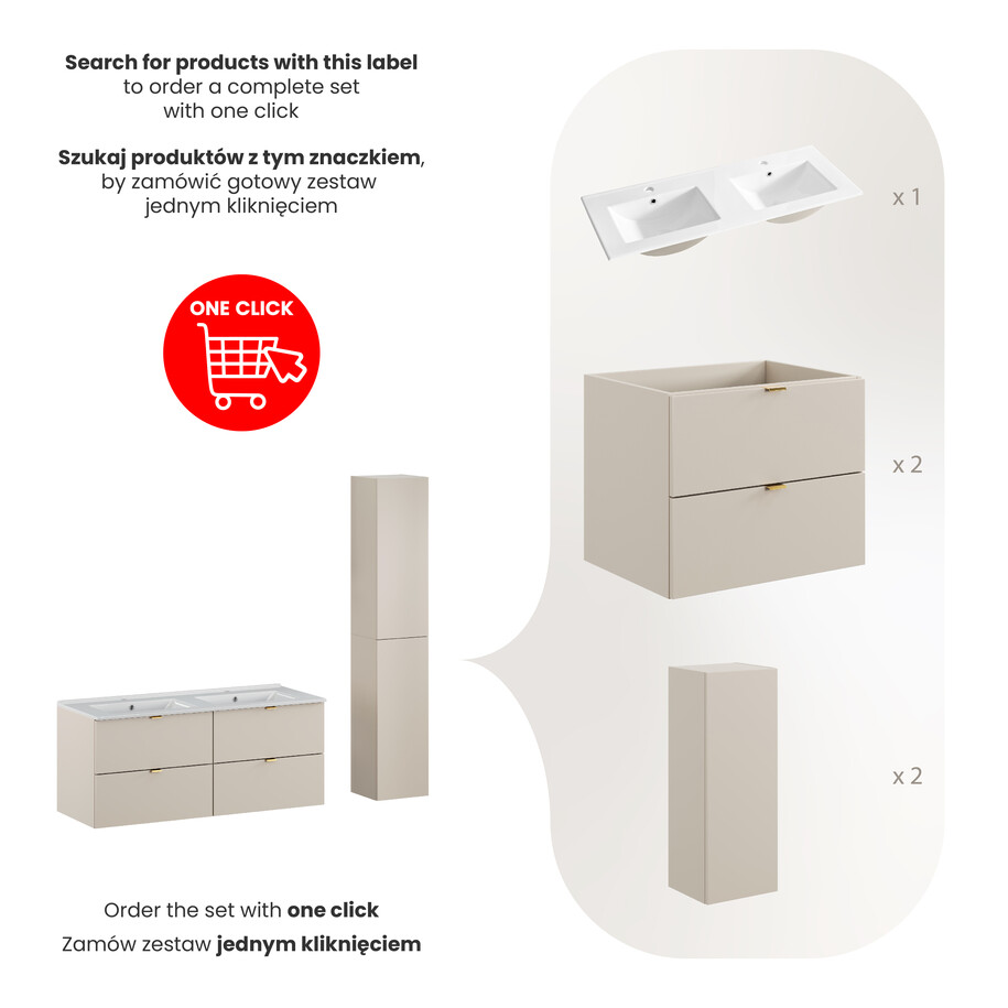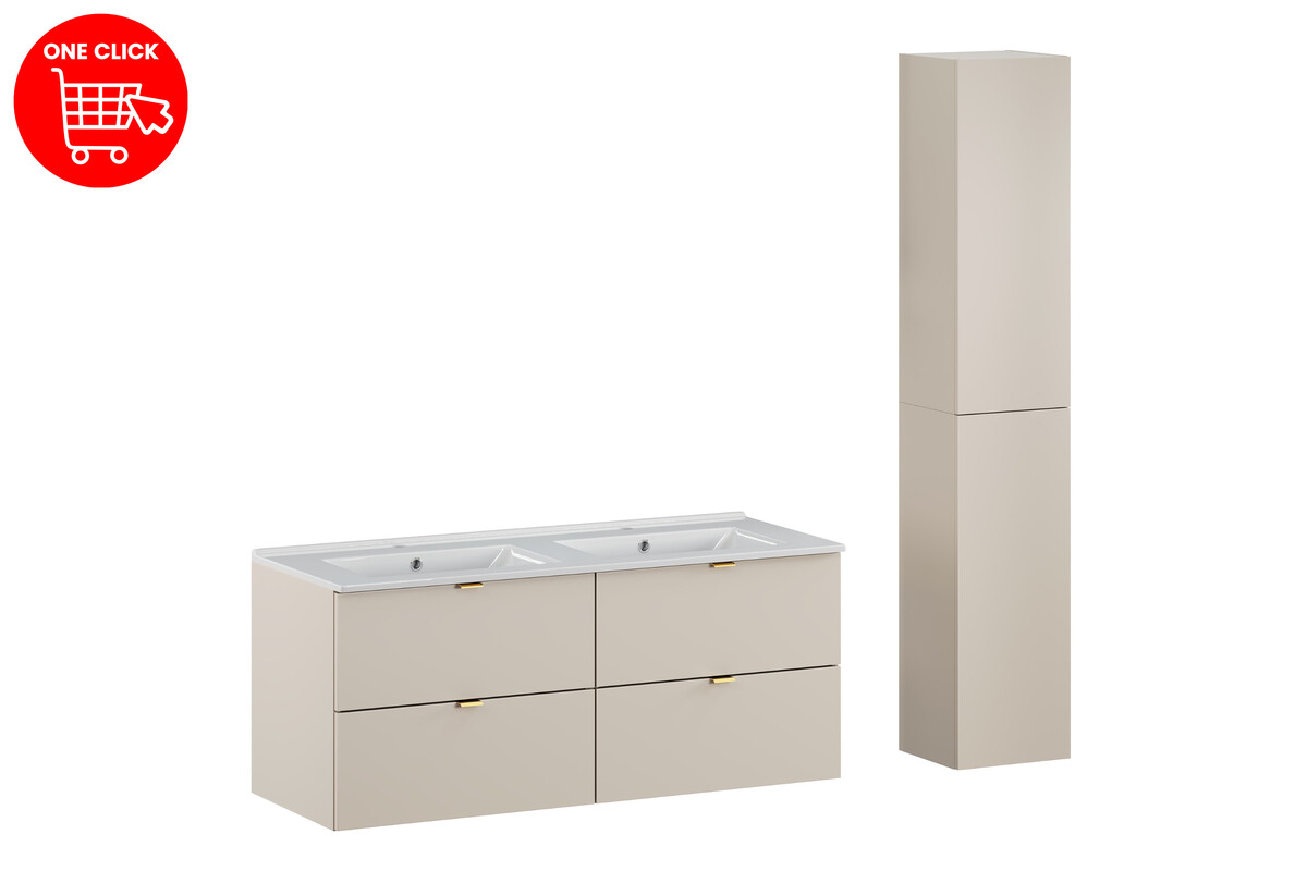Komplektas pasižymi akį traukiančia kašmiro matinės spalvos apdaila, kuri ne tik atrodo prabangiai, bet ir puikiai dera su bet kokiu interjero stiliumi. Baldai yra ergonomiškai sukurti, kad užtikrintų patogumą ir leidžia lengvai išlaikyti tvarką jūsų vonios kambaryje.