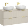 Šis komplektas, susidedantis iš dviejų spintelių praustuvui ir praustuvės, užtikrina idealų funkcionalumą. Jis ne tik puikiai dera, bet ir suteikia reikiamą vietą visiems būtiniesiems vonios aksesuarams.