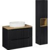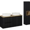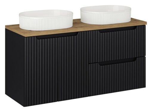 Su unikaliu kombinacija juodos matinės su Wotan ąžuolu, šis komplektas ne tik išsiskiria elegantiška išvaizda, bet ir suteikia šilumos bei natūralumo jūsų vonios kambariui. Vertikalūs frezuoti elementai ant baldų frontų prideda originalumo, o minimalistiniai dizaino akcentai sukuria harmoniją.