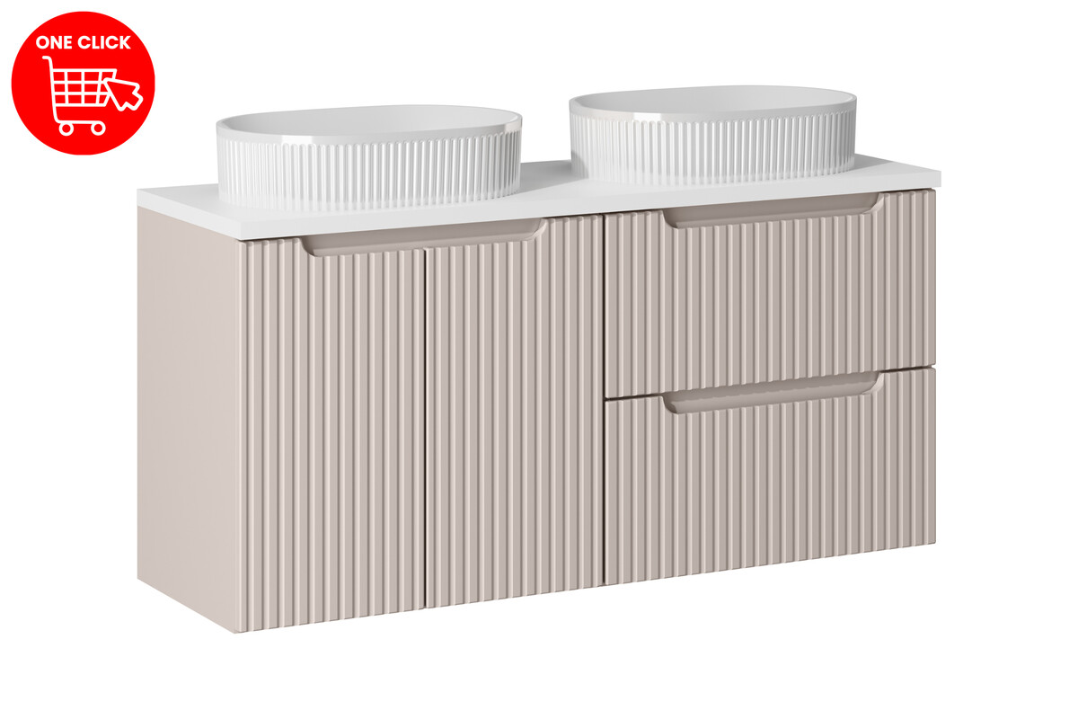 Pasirinkus iš Nova Cashmere kolekcijos, jūs gaunate labai patogius ir prabangius baldus savo vonios kambariui. Dvi spintelės po praustuvėmis ir erdvus stalviršis suteikia jums viską, ko reikia, kad galėtumėte patogiai ir stilingai tvarkytis kasdienėje rutinoje.