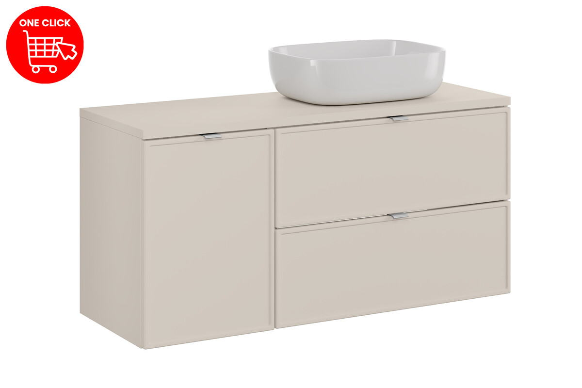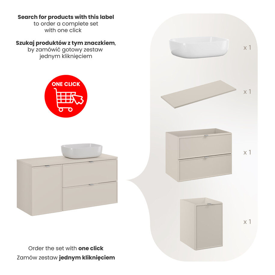 Komplektas apima viską, ko reikia funkcionaliam vonios kambariui. Idealus saugojimas, pakankamai vietos kasdieninėms higienos procedūroms bei elegantiškas praustuvas – visa tai sukuria puikią erdvę, kurioje galima jaustis patogiai ir mėgautis kiekvienu atokvėpiu.