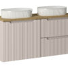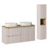 Komplektas apima viską, ko reikia funkcionaliai vonios erdvei: dvi vonios praustuvės, stalviršis ir dvi vonios spintelės, kurios užtikrina pakankamai vietos, kad galėtumėte patogiai laikyti visus vonios reikmenis. Išsamiai suplanuota konstrukcija iš tvirtų medžiagų garantuoja ilgalaikį naudojimą.