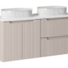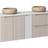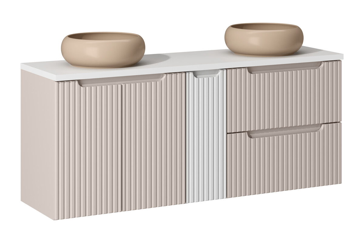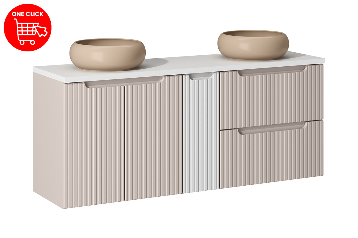 Šis vonios baldų komplektas išsiskiria moderniu ir prašmatniu dizainu, kuris puikiai įsilieja į bet kokį interjero stilių. Su kasmiro ir baltos matinės spalvos deriniu, jis suteikia vėsią ir rafinuotą atmosferą.