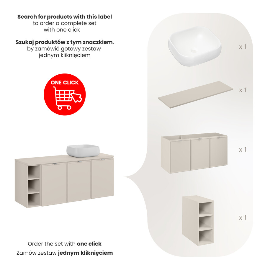 Komplektas priklauso Bella Cashmere kolekcijai, kurios elementai puikiai dera tarpusavyje, leidžiant lengvai pritaikyti juos skirtinguose vonios interjere. Kašmyro matinė spalva ir frezuotas raštas ant durelių ne tik prideda šarmo, bet ir pabrėžia eleganciją jūsų vonios kambaryje.