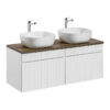 Ši elegantiška vonios baldų komplektacija, susidedanti iš natūraliai atrodančių medžiagų, suteiks šviežumo jūsų vonios erdvei. Kiekvienas gaminys parinktas atidžiai, kad sukurtų harmoniją ir šiuolaikinį dizainą. Spalvų paletė, įskaitant matinius baltus ir ąžuolo tonus, puikiai dera tarpusavyje ir garantuoja estetinį pojūtį.