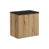 Minimalistinis stilius ir elegantiškos linijos daro šį komplektą idealiu pasirinkimu bet kokiam moderniam vonios interjerui. Baldų derinys su šiltu ąžuolo atspalviu bei matinės juodos spalvos akcentais užtikrina, kad jis integruojasi net ir į pačias elegantiškiausias erdves.