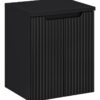 Su matine juoda apdaila ir elegantiškai išfrezuotais frontais, šie baldai suteikia jūsų vonios kambariui šiuolaikišką ir rafinuotą išvaizdą. Rankenėlės šiuo atveju taip pat įsilieja į bendrą dizaino koncepciją, pabrėždamos minimalistinį stilių.