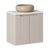 Šio komplekto dizainas pasižymi subtiliais frezuotais frontais, kurie ne tik prideda elegancijos, bet ir užtikrina, kad baldai atrodys šiuolaikiškai ir dailiai. Kashmiro ir baltos matinės spalvos puikiai dera tarpusavyje, sukurdamos harmoningą ir ramią atmosferą.