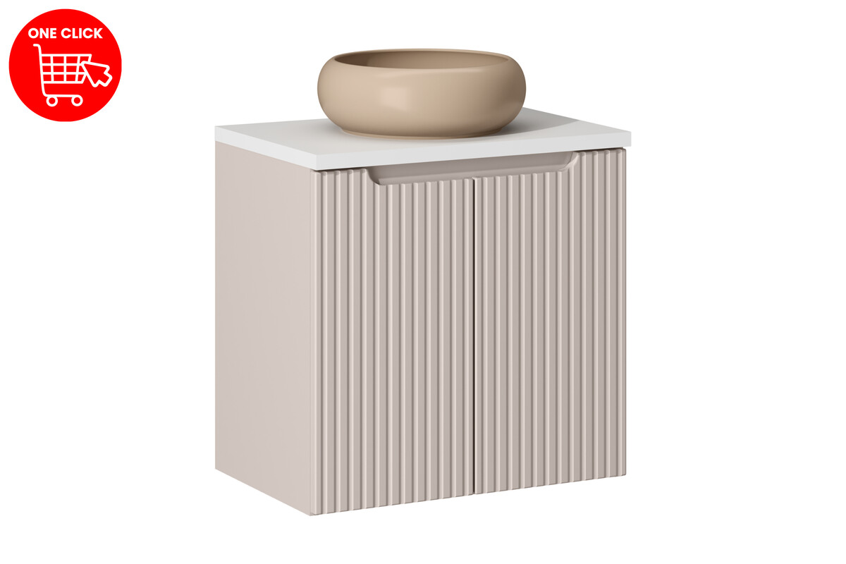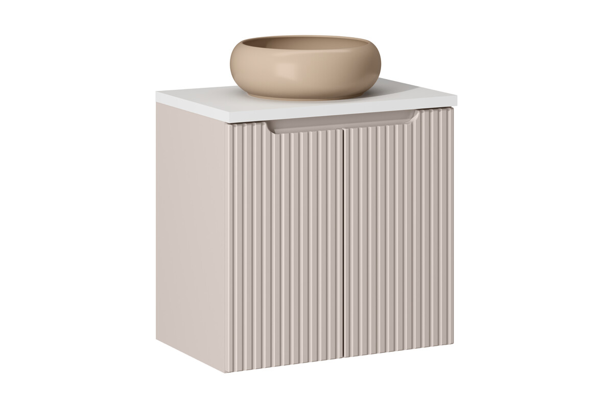 Šio komplekto dizainas pasižymi subtiliais frezuotais frontais, kurie ne tik prideda elegancijos, bet ir užtikrina, kad baldai atrodys šiuolaikiškai ir dailiai. Kashmiro ir baltos matinės spalvos puikiai dera tarpusavyje, sukurdamos harmoningą ir ramią atmosferą.
