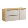 Šis baldų komplektas ne tik yra funkcionalus, bet ir išsiskiria savo estetiškumu. Ąžuolo aliejuota spalva ir švelni smėlio atspalviai suteikia jaukumo ir šilumos pojūtį, o elegantiškos durelių detalės pabrėžia rafinuotumą.