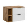 Balti matiniai paviršiai kartu su ąžuolo Wotan akcentais sukuria harmoniją ir šilumą jūsų vonios kambaryje. Frezuotos vertikalios ryklės puikiai papildo bendrą dizainą, o įvairūs rankenėlių pasirinkimai leidžia jums pritaikyti baldus pagal savo asmeninį skonį.