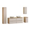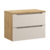Šis komplektas sukurtas remiantis naujausiais baldų dizaino sprendimais. Ąžuolo aliejuotas paviršius ir smėlio spalvos akcentai suteikia šilumos ir elegancijos bet kuriam vonios interjerui. Frezuoto dizaino frontai padaro jį išskirtiniu, o funkcionalumas nepaliks abejonių.