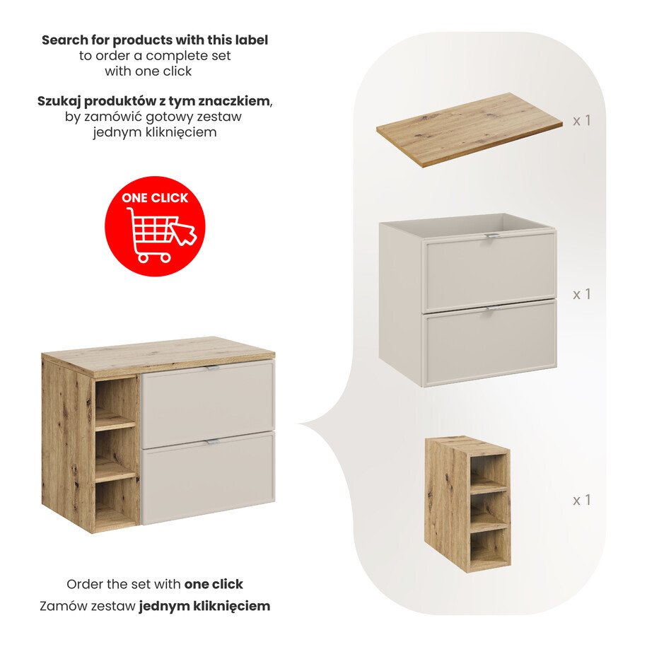 Šis komplektas, priklausantis Bella Cashmere kolekcijai, yra idealus sprendimas norint sukurti harmoningą ir elegantišką vonios interjerą. Stilinga išvaizda ir praktiniai sprendimai daro šiuos baldus ne tik dizaino akcentu, bet ir patogiu įrankiu kasdienei priežiūrai.