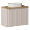 Komplektą sudaro trys pagrindiniai elementai: vonios spintelė, stalviršis ir praustuvas. Kiekvienas iš šių elementų buvo kruopščiai sukurtas, kad ne tik patenkintų jūsų poreikius, bet ir papuoštų erdvę. Frezuotos vertikalios briaunos ir kasmiro spalvos detales pabrėžia baldų modernumą ir stilizuotą išvaizdą.
