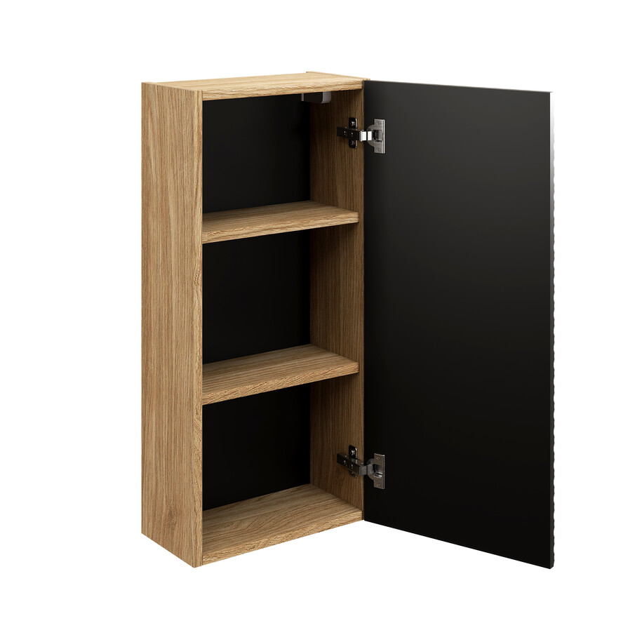 Moderni pakabinama spintelė yra ne tik praktiška, bet ir estetiška. Jos juoda matinė spalva kartu su aliejuotu ąžuolu suteikia elegancijos bet kuriam vonios kambariui. Ši spintelė ne tik taupo erdvę, bet ir suteikia galimybę švariai ir tvarkingai organizuoti jūsų vonios reikmenis.