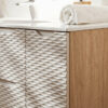 Smėlio spalvos ir aliejuoto ąžuolo derinys suteikia šiai spintelėi elegantišką išvaizdą, tinkamą bet kuriam vonios kambariui. Frezavimas durelių paviršiuje prideda unikalumo ir žavesio. Erdvus interjeras leidžia efektyviai išnaudoti laikymo galimybes, o elegantiški integruoti rankenėlės užtikrina patogų naudojimą.