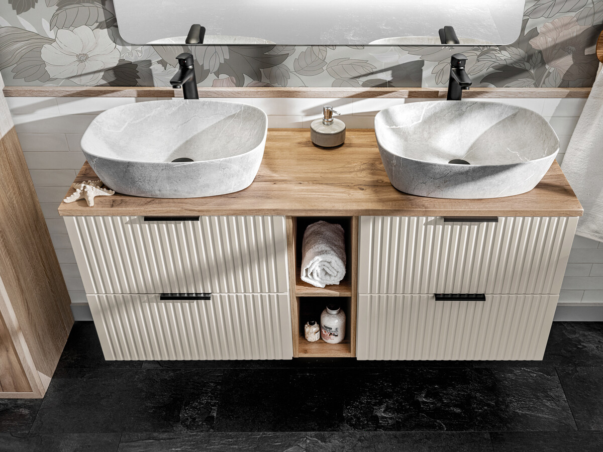 Ši spintelė buvo sukurta tam, kad derintų stilių ir funkcionalumą, suteikdama jūsų vonios kambariui modernią ir jaukią išvaizdą. Jos šiuolaikinis dizainas ir rafinuotas kaszmiro atspalvis puikiai dera su įvairiomis interjero koncepcijomis, todėl tai puikus sprendimas tiek klasikiniam, tiek moderniam interjerui.