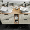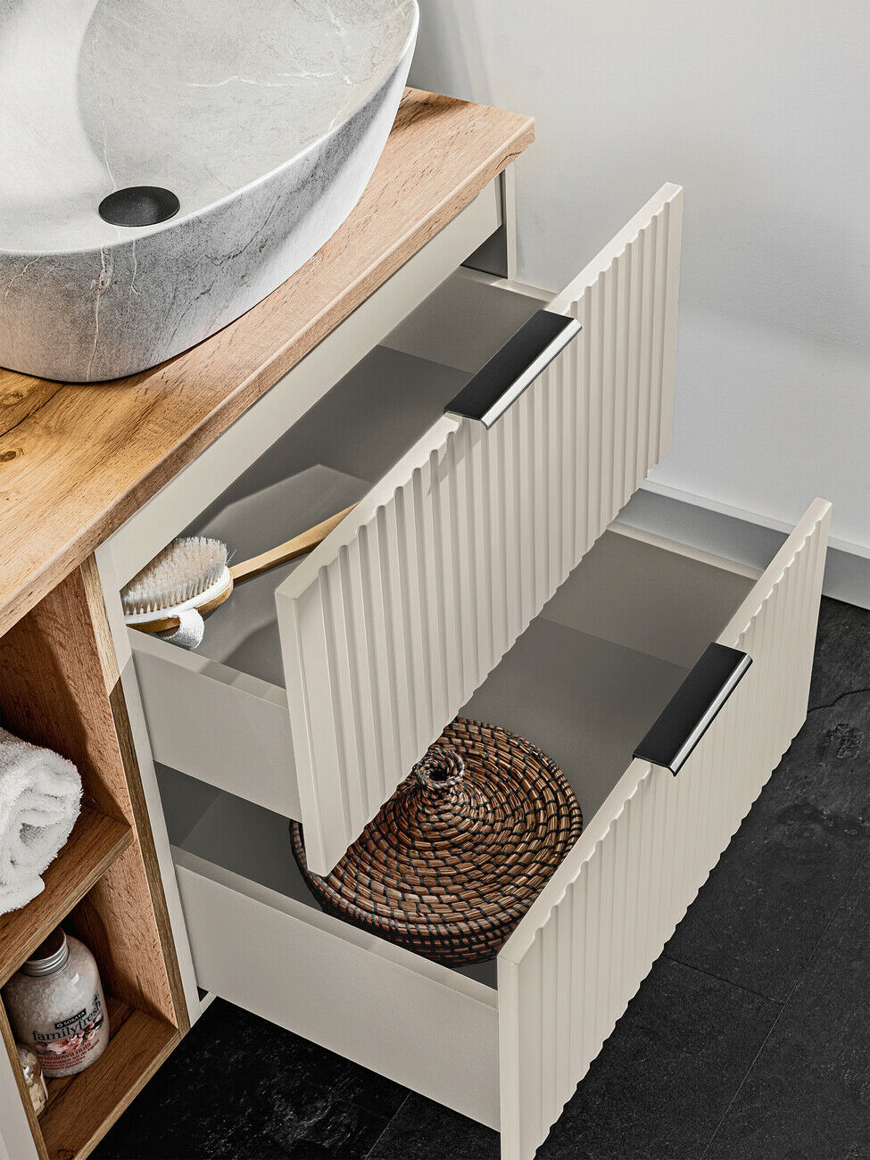 Su dviem erdviais šufladomis, šis baldas užtikrins, kad jūsų vonios aksesuarai būtų tvarkingai laikomi. Jūs galėsite lengvai pasiekti viską, ko reikia, be vargo, o tai svarbu, kai reikia skubiai pasiruošti. Tvirtos medžiagos garantuoja ilgalaikį naudojimą, o kruopštus dizainas leidžia patogiai ir paprastai uždaryti duris bei šufladas.