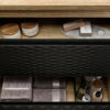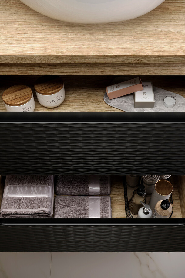 Su šiuo komplektu galėsite patogiai organizuoti savo asmeninius daiktus. Dviejų stalčių dizainas leidžia patogiai laikyti visus būtiniausius daiktus, o integruotos rankenėlės palengvina jų atidarymą. Baldai ne tik sukuria tvarką, bet ir pabrėžia elegantišką jūsų vonios kambario stilių.