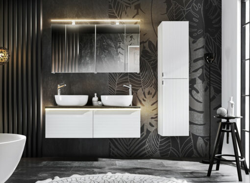 Šis vonios baldų komplektas yra ne tik estetiškai patrauklus, bet ir labai praktiškas. Dviejų durelių spintelė siūlo pakankamai vietos laikyti vonios aksesuarams ir reikmėms. Universali durelių atidarymo sistema padeda lengvai pasiekti visus daiktus, o tylus uždarymas užtikrina ramybę namuose.