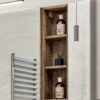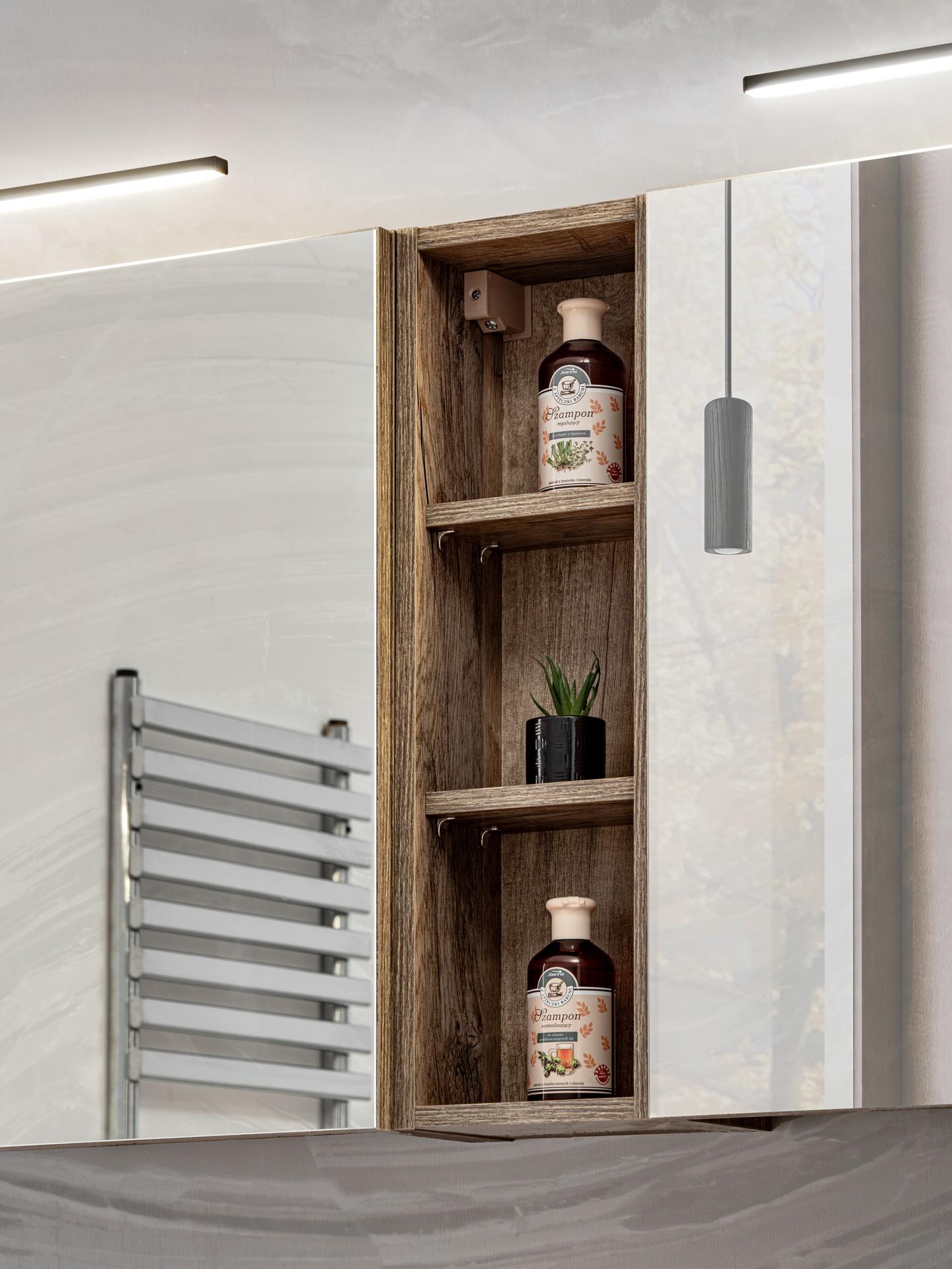 stiklinės lentynos veidrodinėse spintelėse ir aukštoje spintoje