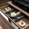 stiklinės lentynos veidrodinėse spintelėse ir aukštoje spintoje