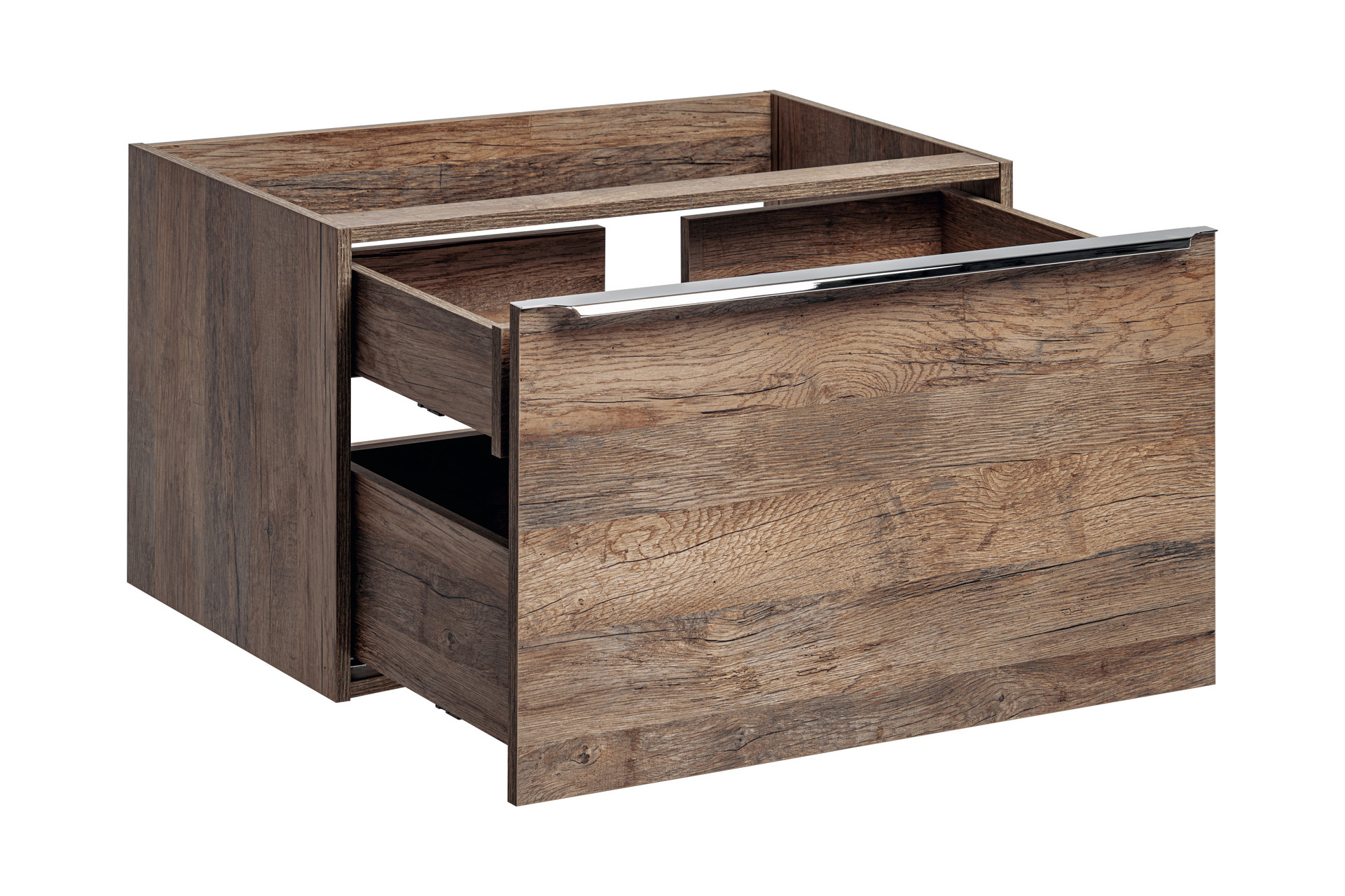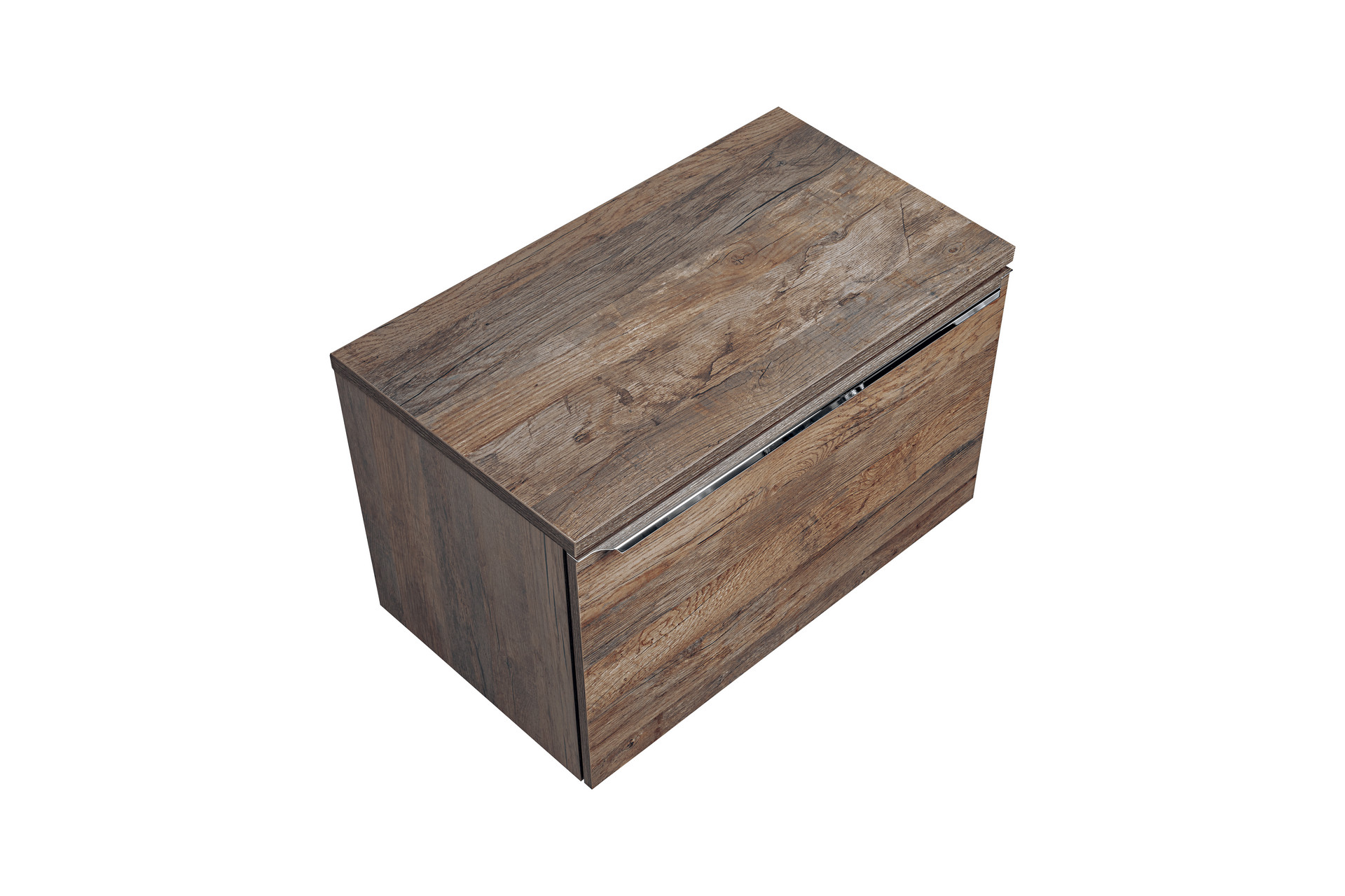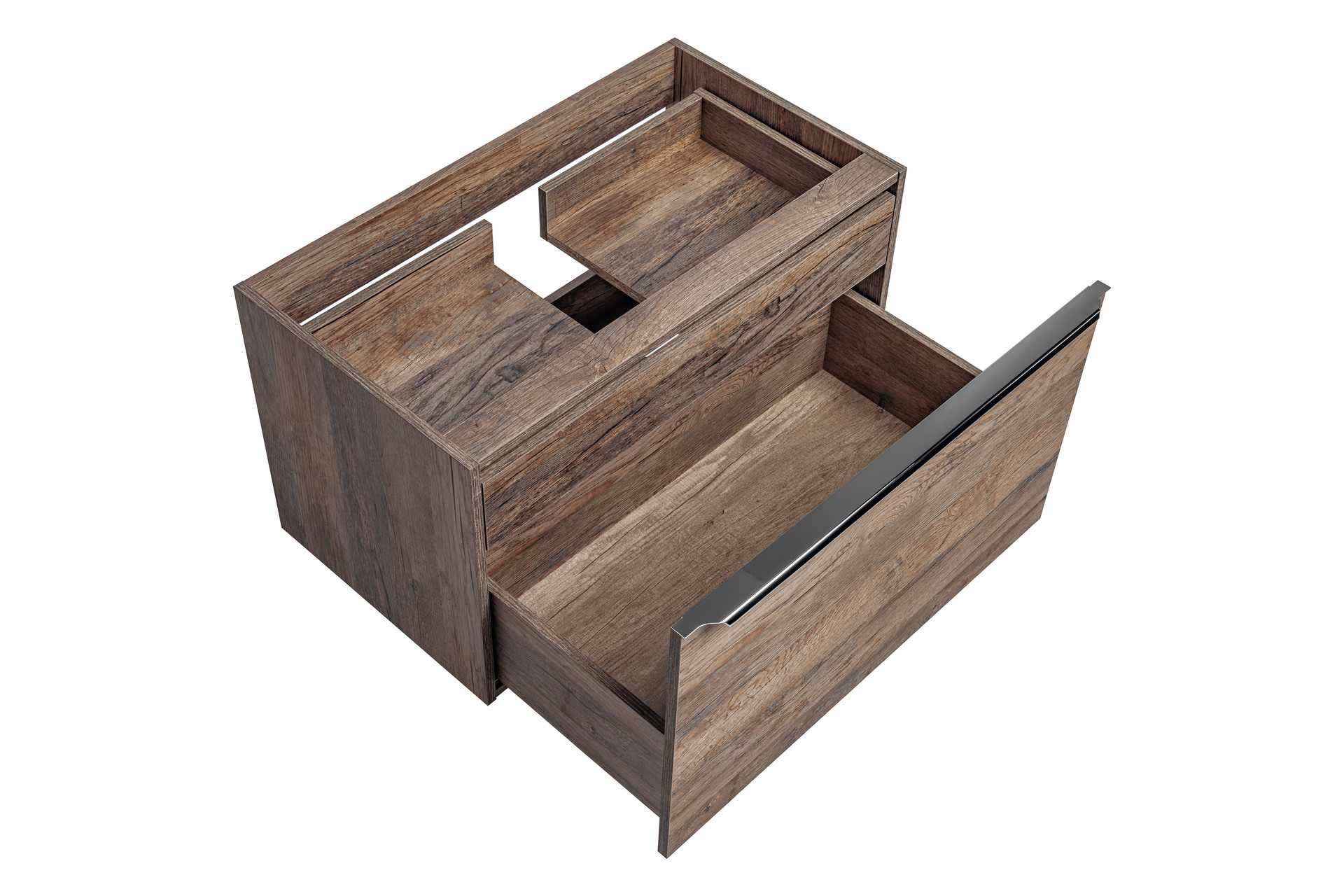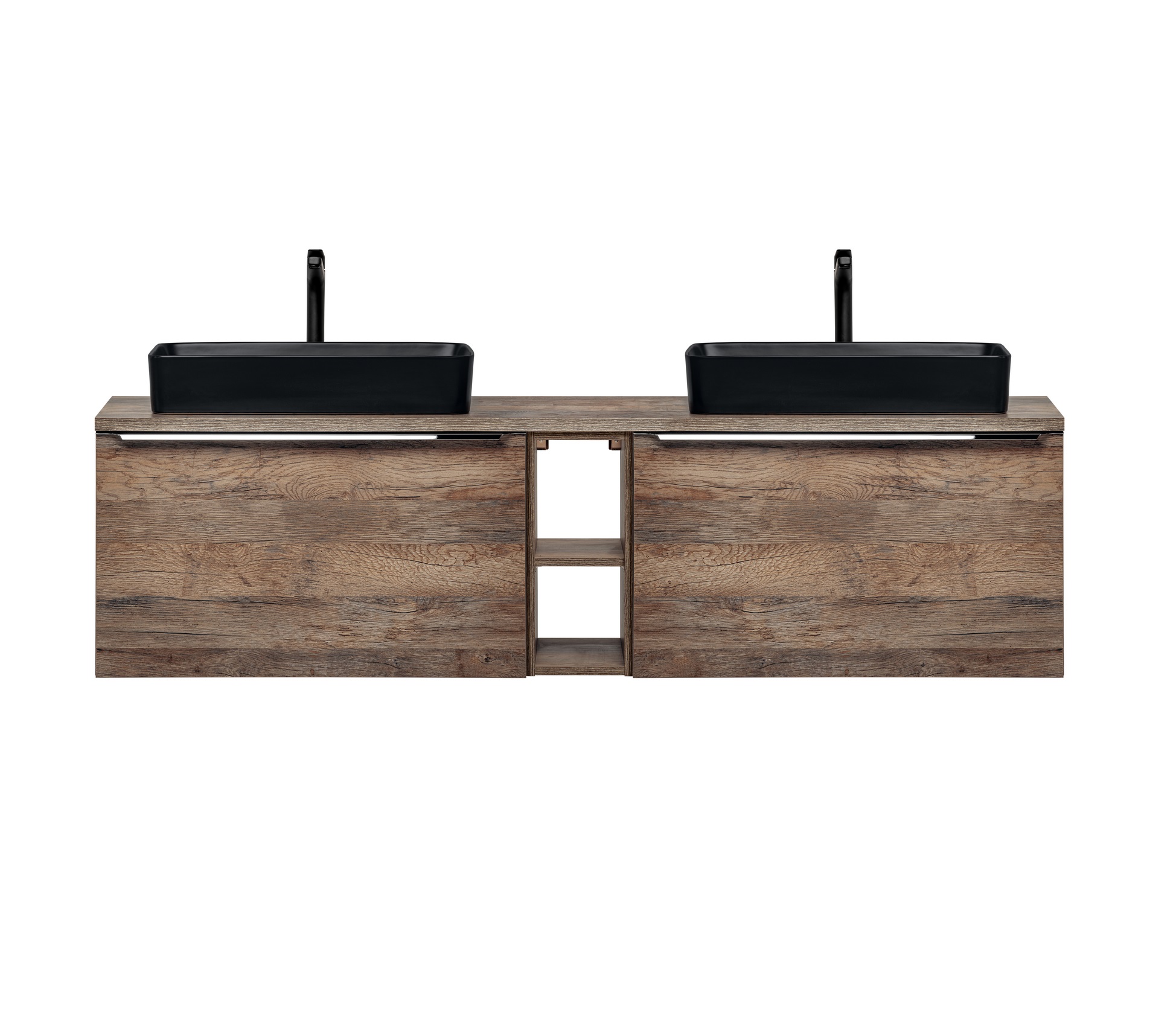Pakabinama tamsinto ąžuolo spalvos vonios spintelė su dvejais praustuvais ir softclose tylaus uždarymo sistema.